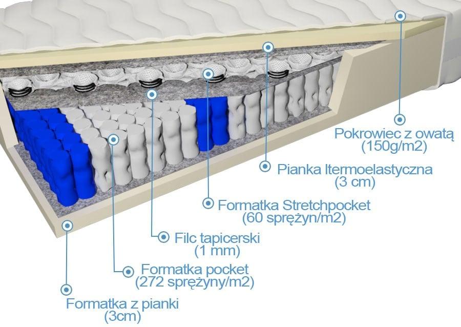Formatka kieszeniowa Double Pocket 7 stref charakteryzuje się ułożeniem na sobie dwóch różnych rodzajów sprężyn. Bazą są sprężyny pocket o wysokości 12 cm. Sprężyny z wysokiej jakości materiału o zróżnicowanym stopniu twardości zostały rozmieszczone w 7 strefach, co zapewnia odpowiednie podparcie dla całej sylwetki. Każda sprężyna osadzona jest w indywidualnej materiałowej kieszonce zapewniającej ugięcie materaca jedynie w punktach nacisku. Na bazowej formatce ułożono cienkie (3 cm) sprężyny stretch pocket. Dodają one sprężystości, wzmacniają materac oraz niwelują wszelkie drgania. Takie rozwiązanie będzie idealne dla par oraz osób ceniących sobie dokładne dopasowanie powierzchni do krzywizny ciała. Na powierzchni materaca umieszczono także warstwę piankiComfort Suite (memory/visco/termoelastyczna), która reaguje na nacisk oraz temperaturę ciała idealnie dopasowując się do kształtu użytkownika. Pianka ComfortSuite zapewnia właściwości ortopedyczne, dlatego swoje zastosowanie znajdzie także u osób z problemami krążenia, niwelując nackisk na ciało.