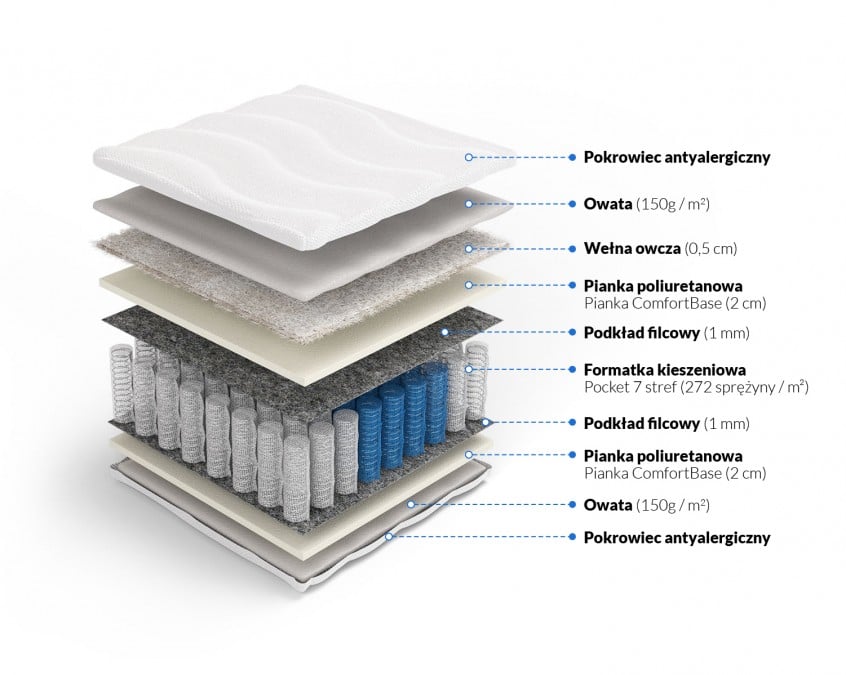 Kupując materac w naszym sklepie dostajesz także antyalergiczny pokrowiec – jego cena jest wliczana w cenę materaca. Zdejmowanie pokrowca ułatwia wbudowany zamek błyskawiczny. Do tego materaca polecamy stelaże bez regulacji. Materace pocket należy użytkować ze stelażami, których prześwit listew nie jest większy, niż 5 cm.
